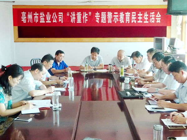 9月14日上午,亳州市鹽業公司黨委召開“講政治、重規矩、作表率”專題警示教育民主生活會。省公司黨委書記詹先豪率相關處室負責人參加會議。亳州市公司黨委書記李文俊主持會議,亳州市公司黨委全體成員參加會議,所屬三縣公司黨政主要負責人及市公司本部支部書記列席會議。
