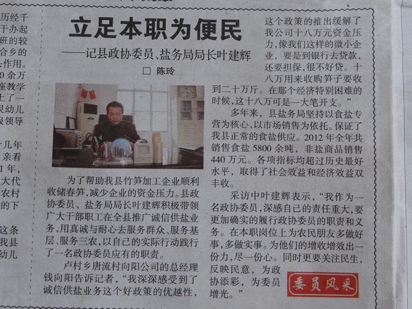 為了幫助我縣竹筍加工企業順利收儲春筍,減少企業的資金壓力??h政協委員、鹽務局局長葉建輝積極帶領廣大干部職工在全縣推廣誠信供鹽業務,用真誠與耐心去服務群眾、服務基層、服務三農,以自己的實際行動踐行了一名政協委員應有的職責。