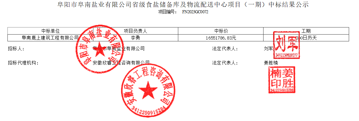 阜陽市阜南鹽業有限公司省級食鹽儲備庫及物流配送中心項目(一期)中標結果公示