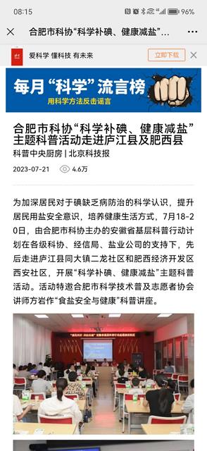 如何科學補碘?怎樣科學食用鹽?為提升居民用鹽安全意識,培養健康生活方式,7月下旬,由合肥市科協主辦的“惠民興村、共創名城”安徽省基層科普行動計劃先后走進廬江縣同大鎮二龍社區、肥西縣經濟開發區西安社區、巢湖市伍賈社區,開展“科學補碘、健康減鹽”主題科普活動。