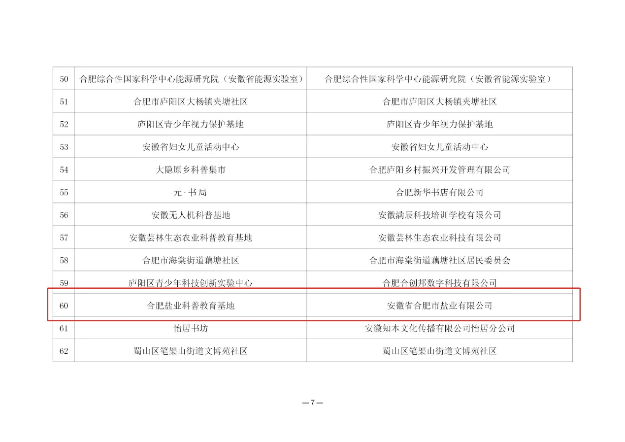9月21日,合肥市科學技術協會經各地各單位申報推薦、評審、驗收、公示等程序,正式發文公布命名合肥鹽業等126家場館為“2023-2026年度合肥市科普教育基地”。